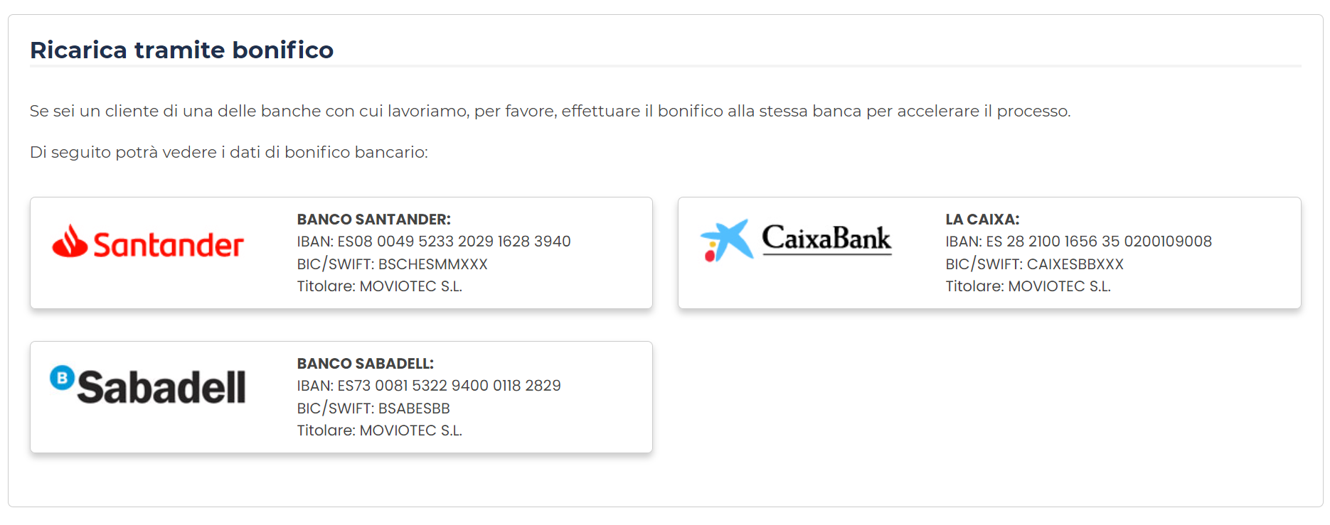 Una volta accettata la ricarica del credito tramite bonifico, ad esempio, conoscerai l'elenco delle diverse banche con cui Sendiroo lavora.